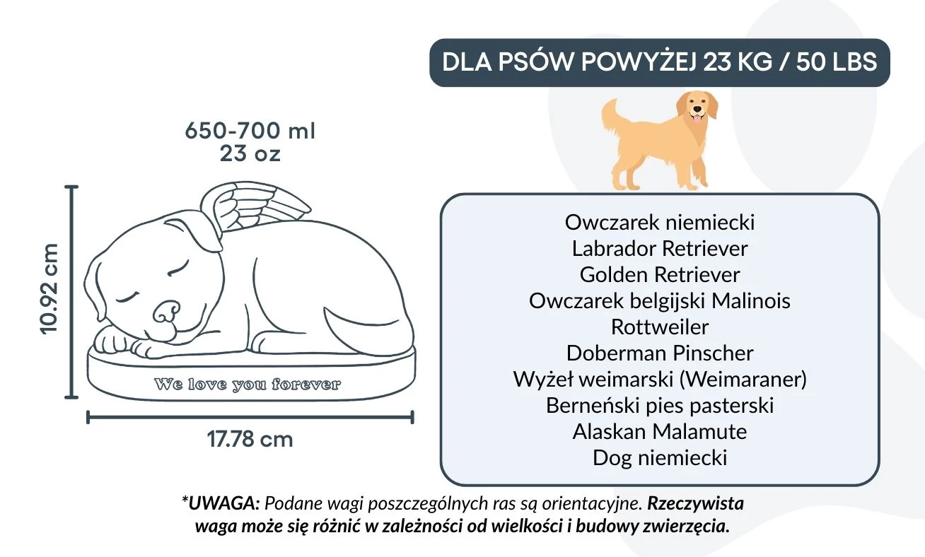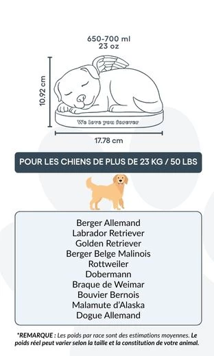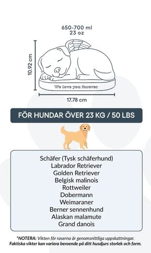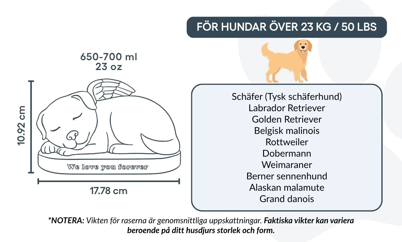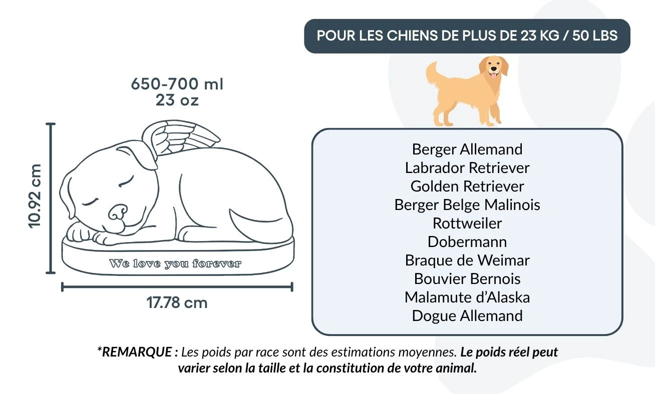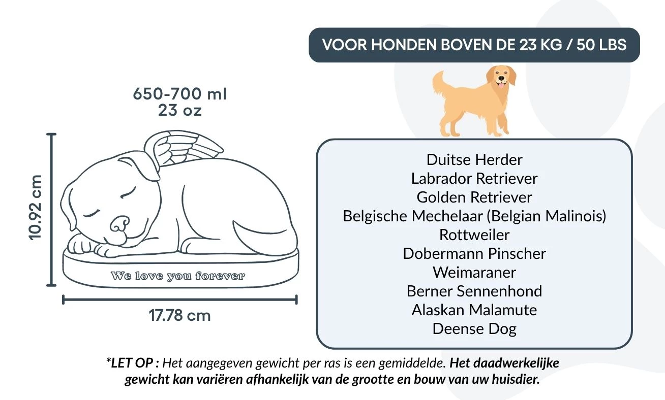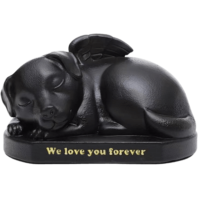 Crafted from durable, weather-resistant resin, this beautifully detailed urn features a peaceful angel dog resting in eternal sleep—an emblem of devotion, protection, and everlasting peace. The discreet inner compartment securely holds your pet’s ashes, offering a dignified and comforting memorial that harmonizes with any natural setting.