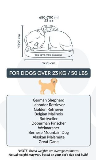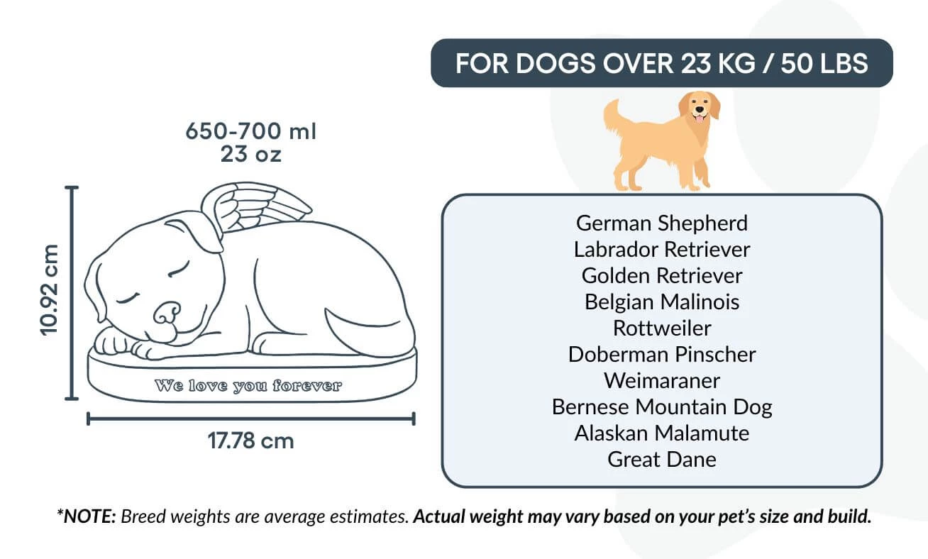 Note: Volume estimates are based on average pet cremation yields. Please consider your pet’s weight and build when choosing an urn.