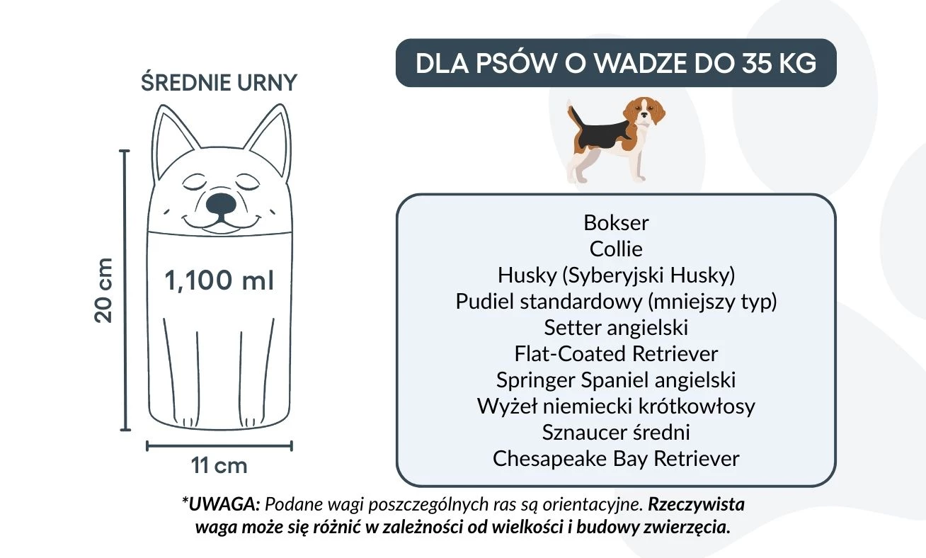 Medium: 11 cm W x 20 cm H | ~1100 ml | For dogs up to 35 kg