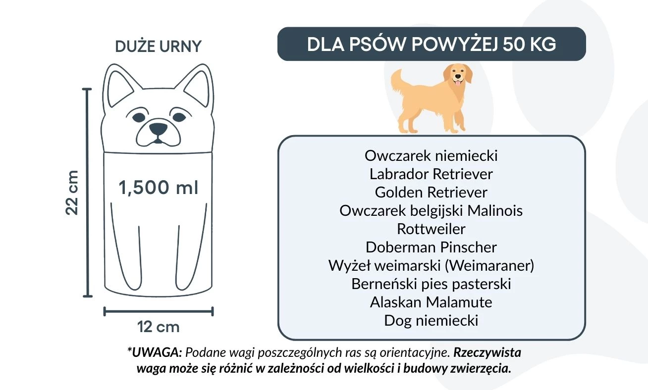 Available in three sizes for breeds up to 50 kg, this personalised dog urn offers space for custom text and is ideal for cremation ashes. The secure, sculpted form ensures safe storage and a timeless look for indoor display.
