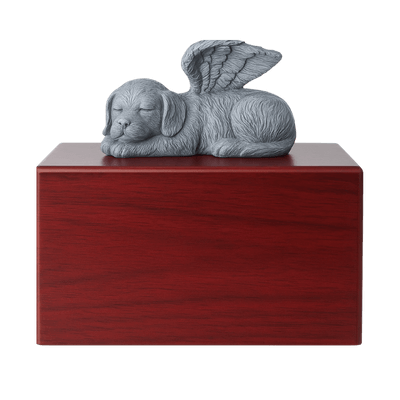 Personalised Wooden Pet Urn Box with Angel Dog Statue – Cremation Urn for Ashes with Name, Dates & Tribute